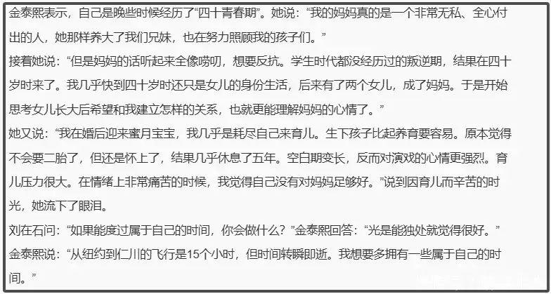 ——金泰熙感慨,40岁之前,她还是女儿,40岁之后,她有了两个女儿,突然成了妈妈,终于开始了解妈妈的感受,意识到母亲的无私与伟大;