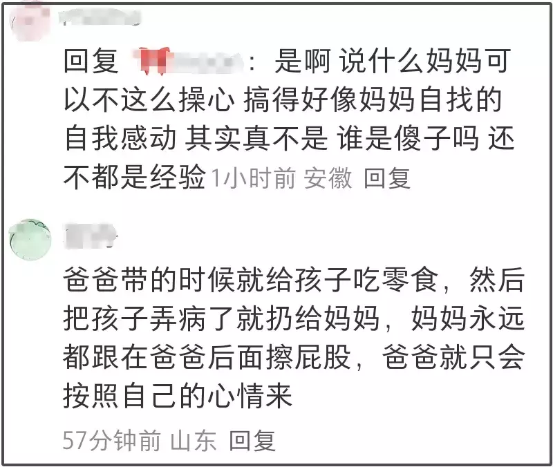 做了妈妈的网友纷纷站出来维护金泰熙,爸爸用零食和垃圾食品当礼物,讨好孩子,轻松换来孩子的亲近,把妈妈衬托成坏人,可是当孩子因为不健康的饮食不舒服乃至生病,被责怪的永远只有妈妈,承担责任、照顾孩子的还是妈妈——妈妈不是瞎操心,更不是自我感动,只是更有责任心啊。