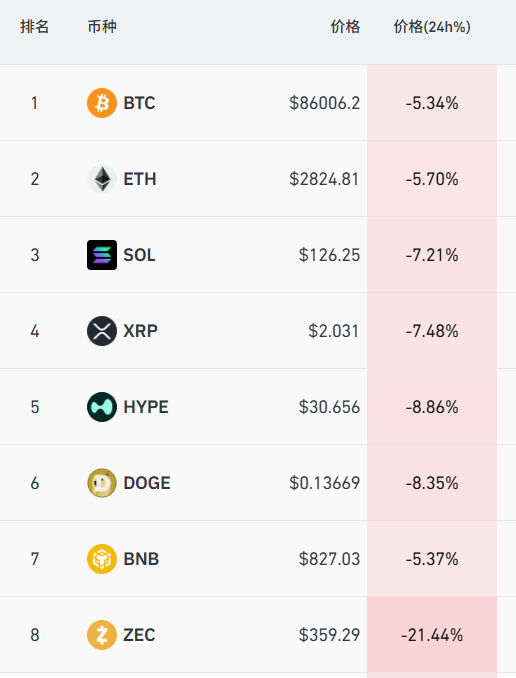 加密货币市场持续走低,截至14:33,比特币跌至86000美元关口,日内跌5.34%。以太坊跌超5%,索尔币、狗狗币等跌超7%。coinglass数据显示,最近24小时,全球超21万人被爆仓,爆仓总金额为6.39亿美元。